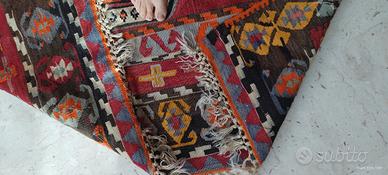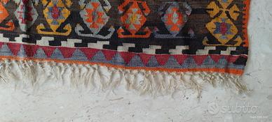 Grande tappeto kilim turco vintage anni '50, in pura lana, tessuto a mano, con certificato di garanzia. Proveniente dalla regione di Corum, Anatolia centrale, autentitco, in perfette condizioni. Un pezzo da collezione