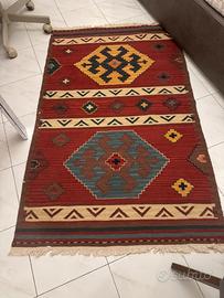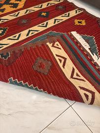 Splendido tappeto Kilim di origine orientale caratterizzato da una tessitura piatta realizzata completamente in lana 100%.Colori e motivi geometrici suggeriscono un origine tra Afghanistan e Persia con motivi e simboli tribali tipici della popolazione nomade.misure cm 150x100.non spedisco, ritiro sul posto.