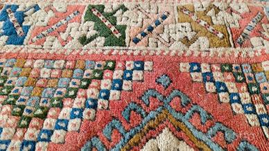 tappeto Kilim turco in lana con disegno geometrico. Fatto a mano con tonalità del rosa antico e blu. misure: altezza 96cm larghezza 149cm
