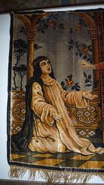Vendo tappeto antico raffigurante la Madonna del Rosario col Bambino Gesù sulle ginocchia che tende la corona del rosario a Santa Caterina da Siena inginocchiata alla Sua destra mentre alla sinistra del trono è inginocchiato San Domenico. La Vergine è in abito e manto rosso. I santi vestono il saio domenicano.