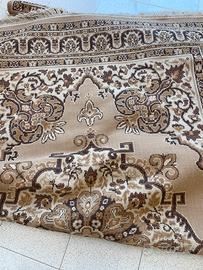 Vendo elegante tappeto in stile marocchino, con disegno centrale floreale e bordi decorativi nei toni del beige, marrone e crema.