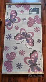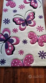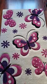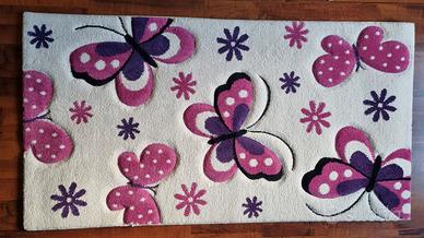 Tappeto Diamond Merinos Questo tappeto specificato come “specially produced frisee hand-carved quality” è con vello in polipropilene quindi anallergico, antiacaro e antitarma e facile da pulire. Risulta morbido al tatto e compatto che contribuisce ad evitare l'effetto impronta al passaggio. Il design presenta motivi di farfalle e fiori nei toni del rosa e del lilla su uno sfondo beige chiaro.