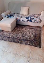 Vendo per trasloco in casa piccola tappeto fatto a mano Nain anni 70/80 molto bello, beige blu con fiori turchesi brillante, misura per divano tre posti. Nelle foto i dettagli dei nodi fatti a mano e della scritta Kufico araba sui bordi del tappeto. Il tappeto presenta leggera opacità sfumata verso un lato come molti tappeti con 40/50 anni di vita