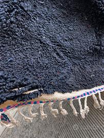 Tappeto nero/blu notte a pelo lungo con frange fatto a mano in Marocco in fibra naturale Misure 250 cm x 150 cm Bordatura azzurro e rosa