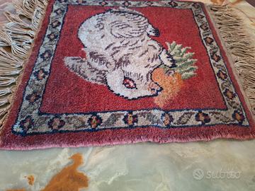 Piccolo tappeto orientale vintage, caratterizzato da un raro motivo figurativo di tipo “pictorial rug”. Il disegno centrale raffigura un coniglio intento a mangiare una carota, elemento decorativo insolito e ricercato, circondato da una bordura geometrica di ispirazione tradizionale. Per stile e impostazione decorativa potrebbe essere riconducibile alla produzione persiana o turca di metà XX secolo, tipica dei tappeti figurativi realizzati per uso decorativo o da parete. Realizzato verosimilmente in lana con lavorazione annodata a mano. La trama è compatta e le frange sono parte integrante dell’ordito, come da manifattura tradizionale. Le dimensioni ridotte lo rendono ideale come oggetto da collezione, piccolo tappeto ornamentale o elemento decorativo particolare e decorativo. 📏 Dimensioni: circa 30 x 32 cm 📌 Condizioni: Buono stato generale, con normali segni del tempo coerenti con l’epoca. 📦 Spedizione accurata e tracciata 📌 Le foto rappresentano esattamente l’oggetto in vendita Per ulteriori informazioni o immagini resto a disposizione