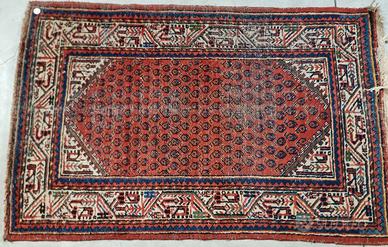 Realizzato con vello in lana e trama e ordito in cotone, come visibile dal retro. Colori caldi e ben armonizzati (rosso mattone, blu, avorio e nero), tipici delle produzioni di inizio–metà Novecento.