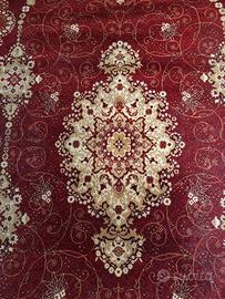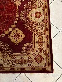 Tappeto rosso intenso, ricco di decori floreali e geometrici, prevalentemente in oro e beige.