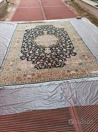 Magnifico tappeto orientale rettangolare, realizzato nello stile Tabriz con pregiata miscela di lana e seta, in grado di valorizzare con classe ambienti di grande respiro: saloni, sale da pranzo, ingressi scenografici o open space.
