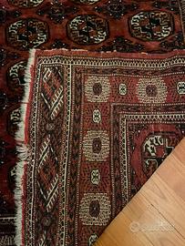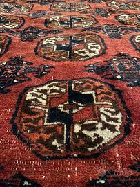 Il tappeto presenta un elegante disegno Bokhara, con i suoi iconici motivi geometrici “gul” ripetuti su uno sfondo rosso rubino intenso, arricchito da dettagli neri, avorio e marrone scuro. Le trame e i colori caldi lo rendono perfetto per dare personalità sia a interni classici che moderni.