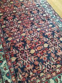 Tappeto orientale vintage in lana, realizzato a mano. Colori predominanti blu scuro e rosso, tipico dei tappeti dell'Anatolia e dell'Asia Centrale.