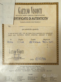 Tappeto orientale annodato a mano Gaetano Visconti. Presenta certificato di autenticità. Dimensioni: 200 cm x 140 cm Ritiro a carico dell'acquirente ad Artena (RM).