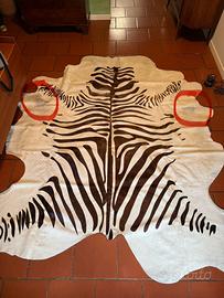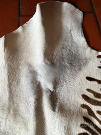 Tappeto pelle di mucca colorato tipo zebra. Buono stato tranne i difetti evidenziati in rosso (dove appoggiavano le gambe di un divano, dettagli nella ultima foto).
