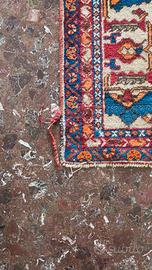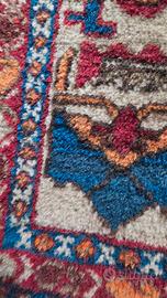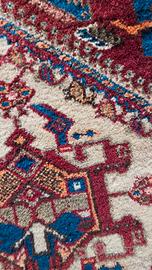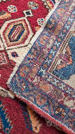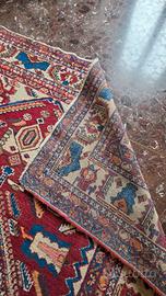 Tappeto Persiano disegno geometrico, con un grande medaglione centrale a esagono allungato su fondo rosso brillante, circondato da motivi stilizzati e bordura chiara a contrasto. Piccolo difetto bordo (VEDI FOTO) Dimensioni 200x155
