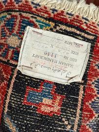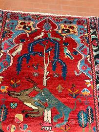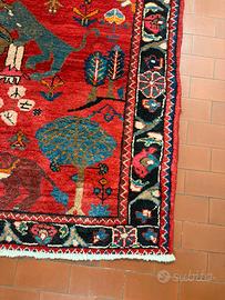 Tappeto persiano figurativo annodato a mano – circa 200 x 140 cm Bellissimo tappeto persiano artigianale con raro disegno figurativo raffigurante animali e scena naturalistica (leone, cervo, cavallo e uccelli), tipico della tradizione decorativa mediorientale. • Dimensioni: circa 200 x 140 cm (verifica precisa consigliata) • Lavorazione: annodato a mano • Materiale: lana su trama in cotone • Origine: Iran (manifattura Hamadan/tribale, come indicato anche dall’etichetta) • Colori: rosso intenso con dettagli blu, avorio e verde • Condizioni: buone condizioni generali, con normali segni del tempo Il tappeto presenta una composizione vivace e narrativa, con elementi simbolici della cultura persiana (animali, alberi della vita, motivi floreali). La bordatura scura incornicia il campo centrale creando un forte impatto visivo. Perfetto come pezzo decorativo, ideale per soggiorno, studio o ambiente eclettico