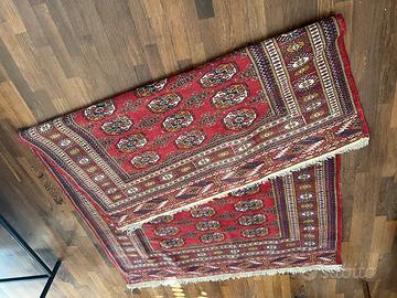 Tappeto Persiano originale Buckara in pura lana vergine con colori intensi e design geometrico. Lavorazione artigianale con nodi annodati a mano, come dimostra il retro del tappeto. Misure: 125 cm x 150 cm (spessore: 1 cm).