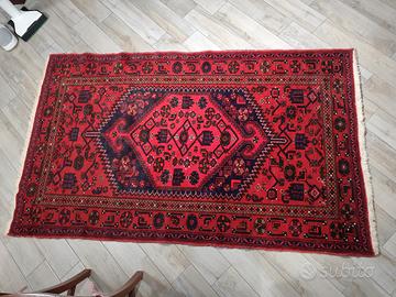 Splendido tappeto persiano artigianale, misura 210x130 cm, in prevalenza rosso con disegno geometrico. Realizzato a mano in Iran (Persia), tipo Karsen R.C., completo di certificato di autenticità Iranian Loom – TV Service S.p.A.