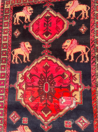 Straordinario tappeto persiano Gabbeh tribale, realizzato a mano con motivi di leoni stilizzati su fondo nero e medaglioni geometrici centrali. Questo runner è un raro esempio di tessitura simbolica proveniente dalle tribù nomadi del Fars (Shiraz/Qashqai), noto per l’uso di figure zoomorfe.