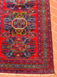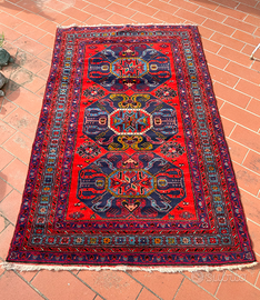 Tappeto tradizionale persiano Hamadan, annodato a mano in lana naturale. Fondo rosso vivo con tre medaglioni geometrici centrali e bordi decorati. Stile rustico, colori intensi. I tappeti Hamadan rappresentano una delle produzioni più diffuse dell’Iran rurale, e ogni villaggio ha una sua variante.