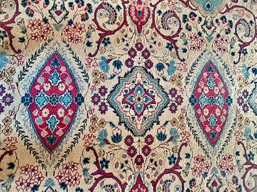 Il tappeto ha un motivo centrale a medaglione con motivi floreali elaborati, tipico dei tappeti Kashan.