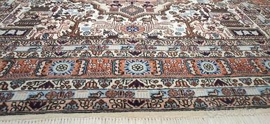 Vendo elegante tappeto in lana e seta, stile persiano classico con medaglione centrale e motivi ornamentali. Colori caldi e raffinati, frange integre.