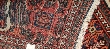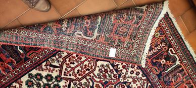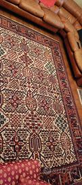 Chiamato Meimeh o Meymeh questo tappeto dal disegno geometrico stilizzato e` stato annodato con lo stesso impianto dall'epoca safavide fino a 50 anni fa. Nella citta' di Josegan in Iran centrale si ripeteva di volta in volta la magia di creare sempre un tappeto diverso partendo dal medesimo schema. Questo pezzo in particolare presenta un bel fondo chiaro sul quale si stagliano i motivi cruciformi giocati in rosso, blu e rosa. Il perfetto stato di conservazione ci fa apprezzare appieno la qualita` delle lane che rendono il tappeto luminoso.