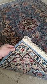 Vendo raffinato tappeto orientale annodato a mano, caratterizzato da un elegante fondo azzurro polvere/grigio e decorazioni floreali policrome. Dimensioni: 153 x 91 cm (frange escluse). Stile: disegno classico con medaglione centrale, ideale per ingressi, camere da letto o sotto un tavolino. Materiale: vello in lana di qualità su trama di cotone. Molto morbido al tatto. Stato: ottime condizioni generali, vello uniforme e colori luminosi. Il tappeto è stato conservato con cura in ambiente senza fumo. Prezzo leggermente trattabile. Solo scambio a mano presso Milano viale Tibaldi (dettagli in privato).