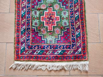 Tappeto persiano orientale di manifattura artigianale annodato a mano in lana. Il tappeto è robusto, in ottime condizioni e non presenta segni di usura .Pulito e igienizzato con metodo domestico. Dimensioni 155x71cm (frange incluse). Paese di origine: Uzbekistan. Sono disponibile ad inviare il video del tappeto per visualizzare meglio i dettagli, colori e condizioni.