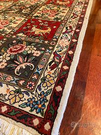 Motivo tradizionale a riquadri (garden design) con ricca decorazione floreale e animale: cervi, uccelli e fiori stilizzati. Colori naturali caldi con predominanza di rosso e blu, arricchiti da tonalità verdi e dettagli policromi.