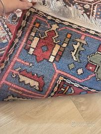 Presenta disegni geometrici e stilizzati, tipici dei tappeti di villaggio o nomadi.