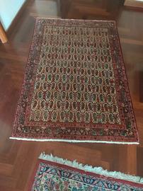 Questo bellissimo e Semi Antico Tappeto Persiano FAHARAN misura zaronim 160 x 110 è stato annodato a mano verso la metà del secolo XX nel distretto di Farahan (provincia centrale di Markazi), da cui prende il nome, questa zona è ricca di villaggi e cittadine che hanno una lunga storia nella produzione di ottimi Tappeti come i Saruq etc., il Tappeto come si può vedere dalla foto presenta il classico disegno Boteh o Mir-e Butha (una pera stilizzata) a tutto campo, ma molte altre interpretazioni del disegno sono (una fiamma, una foglia, una pigna) difficile dire esattamente cosa rappresenti perché questo motivo è presente anche nei tappeti antichissimi e in tante altre tipologie di tappeti nelle varie zone della Persia, magari ogni zona da la sua interpretazione. In questo Tappeto è stata usata la migliore lana che ha permesso anche una stretta annodatura come si vede dalla ultima foto. Il tappeto è rasato in modo uniforme, sono stati rifatti entrambi i bordi ed eseguito il fermo frange un restauro non invasivo ma necessario per l’età del Tappeto. Un pezzo veramente da intenditori e di valore. E’ stato lavato e igienizzato in modo professionale.