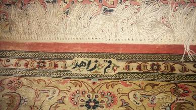 Magnifico tappeto persiano extra fine, seta su seta, firmato Qum Zaher ( sono le indicazioni del cartiglio della firma in alto), annodato nella città di Qum tra gli anni '40 e '60.
