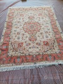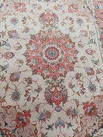 Questo raffinato Tabriz presenta un classico motivo orientale, interpretato in una palette chiara e delicata. Il campo centrale nei toni crema/beige è impreziosito da motivi floreali in rosa antico, pesca e salmone, che conferiscono un aspetto elegante e romantico. La bordura ampia riprende armoniosamente i colori del disegno, incorniciandolo con equilibrio e cura del dettaglio.