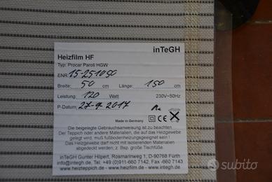sottotappeto riscaldante per mezzi mobili dimensioni : un metro e cinquanta per 50 cm, 120Watt, 230V. completo di termostato automatico.