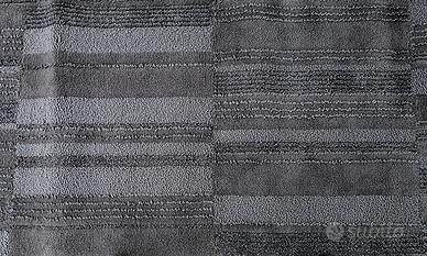 Una Serie di Longitudinali Striature che attraversano tutta la Sua Superficie Cambiando Continuamente e Repentinamente la loro Essenza, dai Toni del Grigio alle Strutture del Filato, creando così Intermittenti ed Impattanti Giochi Materico-Visivi.