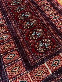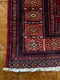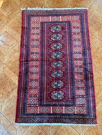 Bellissimo tappeto Bukhara sui toni del rosso a fantasia, con frange. Misure: 160x95