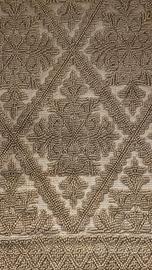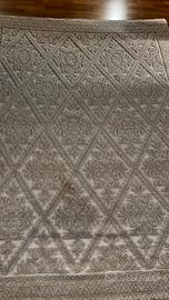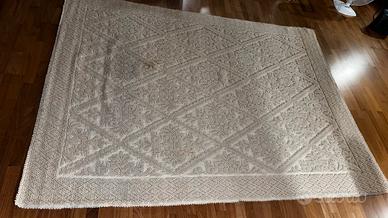 Vendo tappeto sardo tradizionale in lana, colore bianco/panna, lavorato a rilievo con motivo geometrico floreale a rombi, dimensioni 248×187 cm. Il tappeto è usato e presenta alcune macchie visibili nella zona centrale, ma non ha strappi o buchi. Preferibile consegna a mano; per altre foto o informazione scrivimi pure in chat.