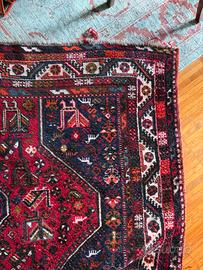 Il materiale appare lana annodata a mano, con buona densità e struttura compatta. Il disegno è tipico della produzione Shiraz, con medaglioni centrali e bordure ricche di motivi tribali.