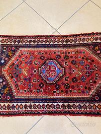 tappeto colori prevalenti rosso vivace, blu con bordatura bianca. Dimensioni lunghezza cm 113 x larghezza cm 68, circa. Già stato in lavanderia.