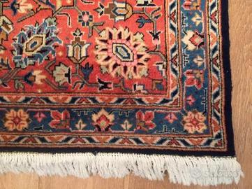L'esemplare in oggetto misura: m. 2,70 x 3,60 è un classico tappeto iranico di qualità extrafine, proveniente dalle botteghe di Tabriz (Azerbaijan persiano) e di recente manifattura, di quelli definiti commercialmente 50 raji, databile attorno all'ultimo quarto del secolo 900. L'impianto iconografico classico di tipo floreal/geometrico con medaglione allungato e pendenti su fondo blu scuro, la regolarità e la perfezione simmetrica dei disegni adottati, il tipo di bordura floreale a palmette piuttosto rigida, nonché la squisita orditura in cotone bianco finemente ritorto, sono tutti elementi che attestano la natura e l'epoca sopraindicate. Il vello rasato, folto e compatto, è in buona lana (presumibilmente Kork), il rovescio mostra una discreta pulizia di esecuzione, con trame in cotone ben ribattute e appena percettibili. L'esemplare è in ottime condizioni, perfettamente in ordine e ben conservato, con vello vivo e lucente - a riprova della squisita qualità delle fibre impiegate - e con frange regolari di cotone finemente ritorto.