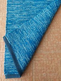 Tappeto in cotone e poliestere colore blue con i bordi blue. Misura 49x98cm. La composizione mista del tessuto lo rende più resistente. Staccando l'etichetta può essere utilizzato da entrambi. È stato lavato 3 volte