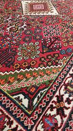Tappeto con medaglione centrale romboidale, quadranti agli angoli "sprandels" tipici dei Bakhtiari, con nodo asimmetrico (persiano), trama e annodatura regolari, dim. 108 x 157 cm.