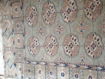 Tappeto turco colore verde acqua con inserti blu, molto gradevole, in buono stato, frange leggermente vissute come in foto, dimensioni 223X140.