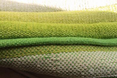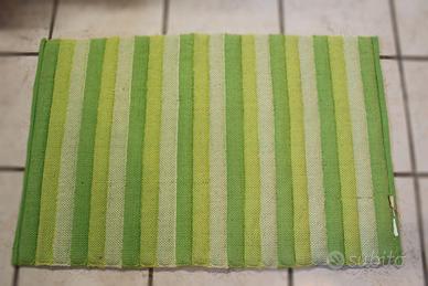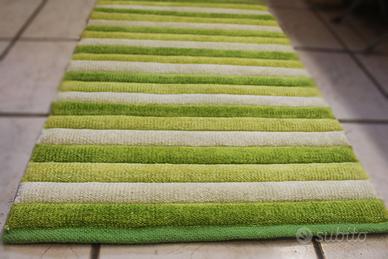 Tappeto morbido a righe in rilievo imbottite, colore sfumature di verde. Misura cm 60 x 95 - Altezza quasi cm 2 - Peso: Kg 2,385 - Purtroppo a suo tempo tagliai le etichette, non ho altre informazioni utili. Usato una volta, ottimo stato.