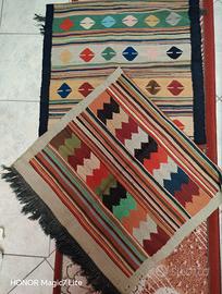 È un tappeto kilim caratterizzato da una tecnica di tessitura piatta senza pelo, spesso realizzato a mano con lana. Tipo: Tappeto kilim (o kelim), noto per la sua trama piatta e l'uso versatile. Design: Presenta motivi geometrici tradizionali, spesso ispirati a culture nomadi. Materiale: Tipicamente realizzato in lana, rendendolo resistente e spesso double-face. Le misure del tappeto grande 260×210,invece i due tappeti piccoli 250×60 I due tappeti piccoli sono in omaggio a chi compra quello grande che è bellissimo