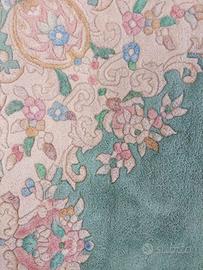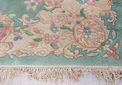 Grande tappeto aubusson cinese risalente agli anni '60 del secolo scorso. Sfondo di tonalità verde con disegni floreali variopinti leggermente in rilievo.
