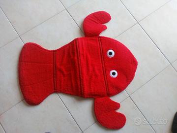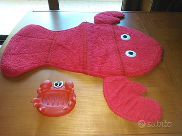 Set bagno composto da tappettino- scendidoccia sagomato a forma di granchio e portasapone coordinato. Tappeto in cotone cm 70 x 72 leggermemte imbottito e portasapone in plastica leggera €7