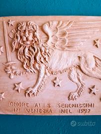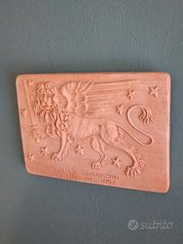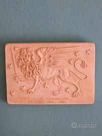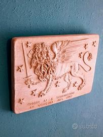 Targa in terracotta con bassorilievo del Leone di San Marco con spada con dedica ricordo onore ai 8 serenissimi in Venezia nel 1997 firmata G.B . ( Gilberto Buson)
