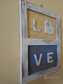 targa in legno quadro con lettere a rilievo LOVE in stile shabby chic realizzato interamente a mano. Misure :31,5x25x1,5 cm.