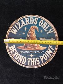 Placca in metallo raffigurante cappello e scritta dedicata ai maghi. Assolutamente da posizionare fuori dalla casa dei nostri maghi, o sulla porta della loro stanza segreta! Misura 20x 30 cm. La placca non è stata mai usata o esposta, è uscita dalla sua busta originale solo per fare queste foto qui sopra