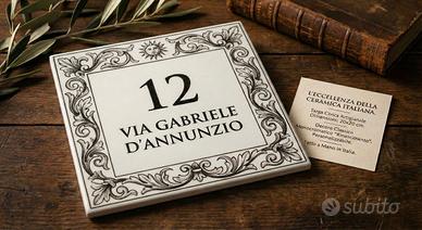 Vendiamo splendide targhe in ceramica artistica, formato 20x20 cm, realizzate su misura per te. Non è il solito numero civico: è un complemento d'arredo che dona stile e personalità alla tua abitazione, villa o B&B.